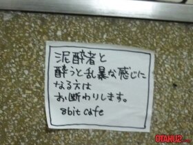 And customers do. It isn't the normal Shinjuku lot up here - a note outside says, "We refuse drunks and people who get drunk and violent." Next to it, an enshrined Famicon, and about being a bum in Tokyo, drawn by a regular customer. Truly, this is one place where even the most unsociable can get out and relax. The staff are geeky and friendly, and engage customers in lively conversation (especially at the counter).